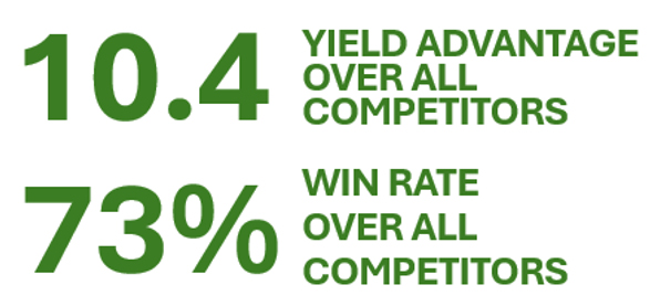 ¹Data is based on an average of IMPACT™ trial comparisons made in the United Sates in 2023 from the new product class. Comparisons are against all competitors, technology segment matched, unless otherwise stated, and within a +/- 3 CRM of the competitive brand. Product responses are variable and subject to any number of environmental, disease and pest pressures. Individual results may vary. Multi-year and multi-location data are a better predictor of future performance. DO NOT USE THIS OR ANY OTHER DATA FROM A LIMITED NUMBER OF TRIALS AS A SIGNIFICANT FACTOR IN PRODUCT SELECTION. Refer to www.pioneer.com or contact a Pioneer sales representative or authorized dealer for the latest and complete listing of traits and scores for each Pioneer® brand product.