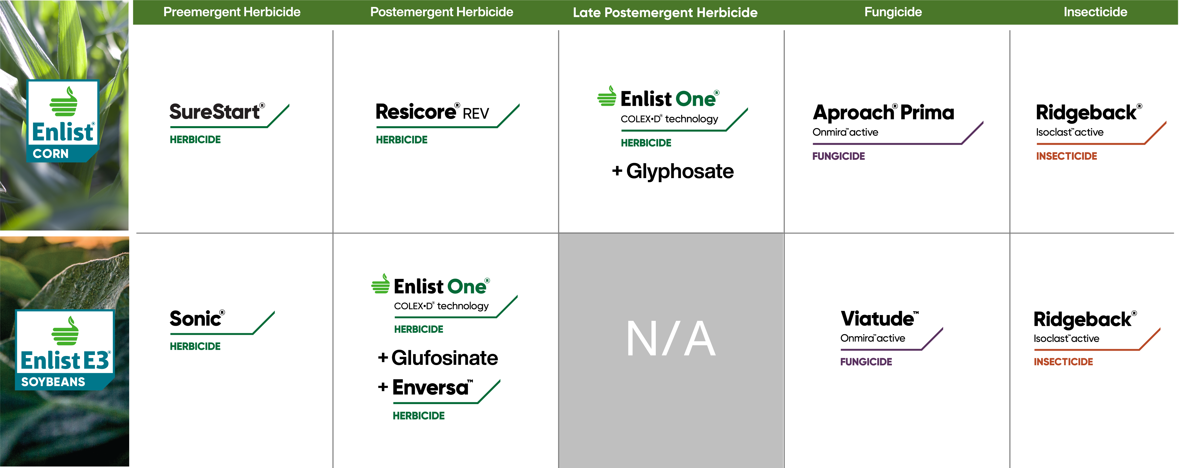 ®™ Trademarks of Corteva Agriscience and its affiliated companies. Enlist E3® soybeans are jointly developed and owned by Corteva Agriscience LLC and M.S. Technologies, LLC. Enlist One is the only 2,4-D product authorized for use in Enlist crops. Not all products are registered for sale or use in all states or counties. Enversa™, Resicore® REV and SureStart® II are not available for sale, distribution or use in Nassau and Suffolk counties in the state of New York. Contact your state pesticide regulatory agency to determine if a product is registered for sale or use in your state or area. Consult the label before purchase or use for full details. Always read and follow label directions. ©2025 Corteva.