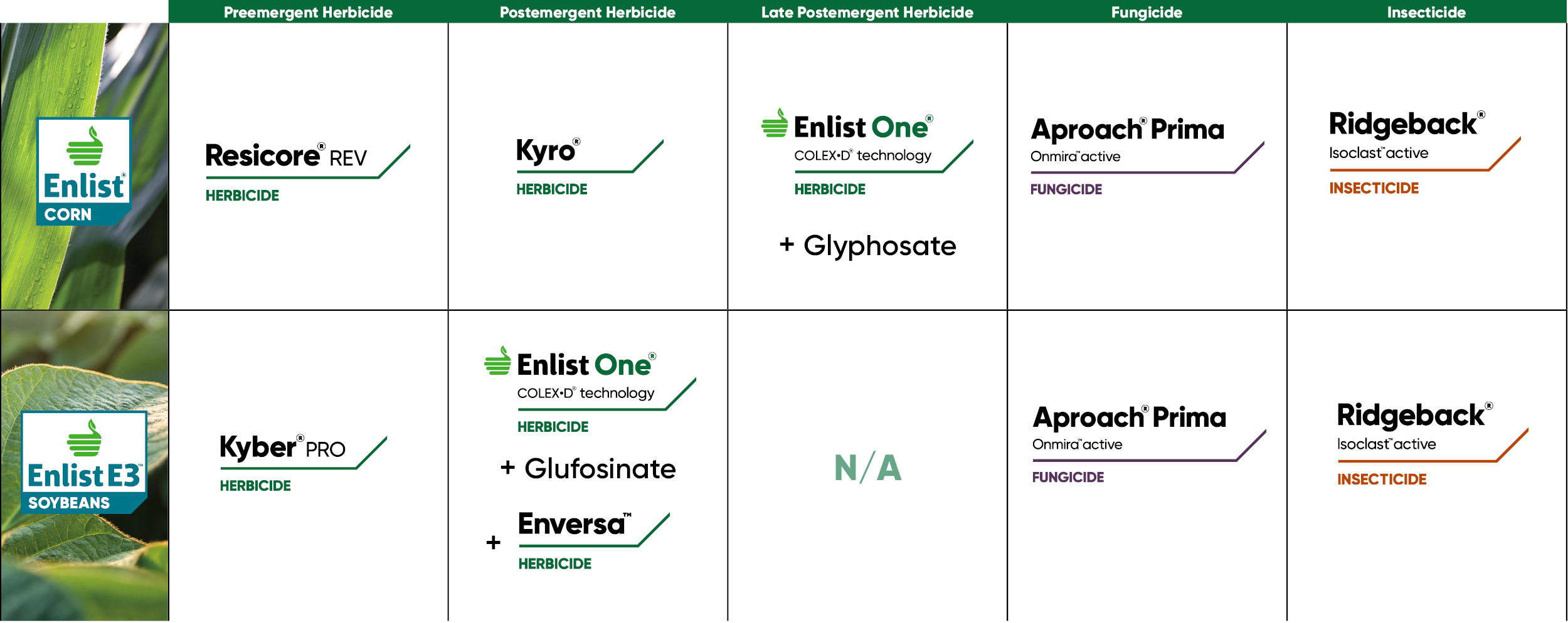 ®™ Trademarks of Corteva Agriscience and its affiliated companies. Enlist E3® soybeans are jointly developed and owned by Corteva Agriscience LLC and M.S. Technologies, LLC. Enlist One is the only 2,4-D product authorized for use in Enlist crops. Not all products are registered for sale or use in all states or counties. Enversa™, Kyro®, and Resicore® REV are not available for sale, distribution or use in Nassau and Suffolk counties in the state of New York. Contact your state pesticide regulatory agency to determine if a product is registered for sale or use in your state or area. Consult the label before purchase or use for full details. Always read and follow label directions. ©2025 Corteva.